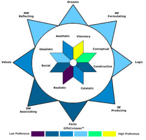Very often the lead type in consciousness will be introverted intuition–the diametric opposite of extraverted sensation. With the Gifts Compass Inventory (GCI) we have also seen introverted thinking or introverted feeling in the lead position.
